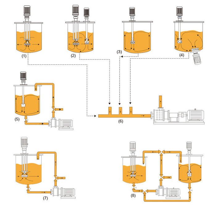 高剪切均質乳化機就是高效、快速、均勻地將一個相或多個相分布到另一個連續相中,而在通常情況下各個相是相互不溶的,由于轉子高速旋轉所產生的高切線速度和高頻機械效應帶來的強勁動能,使物料在定、轉子精密吻合的間隙中受到強烈的機械及液力剪切、離心擠壓、液層摩擦、撞擊撕裂和湍流等綜合作用,與此同時在轉軸上高速旋轉的分散輪的作用,又形成上、下兩股強烈的翻動湍流。從而使不相溶的固相、液相、氣相在相應成熟工藝和適量添加劑的共同作用下,瞬間均勻精細地分散、均質、乳化,罐內物料經過高頻率的上下翻滾和循環往復,最終得到穩定且品質高的物料產品。